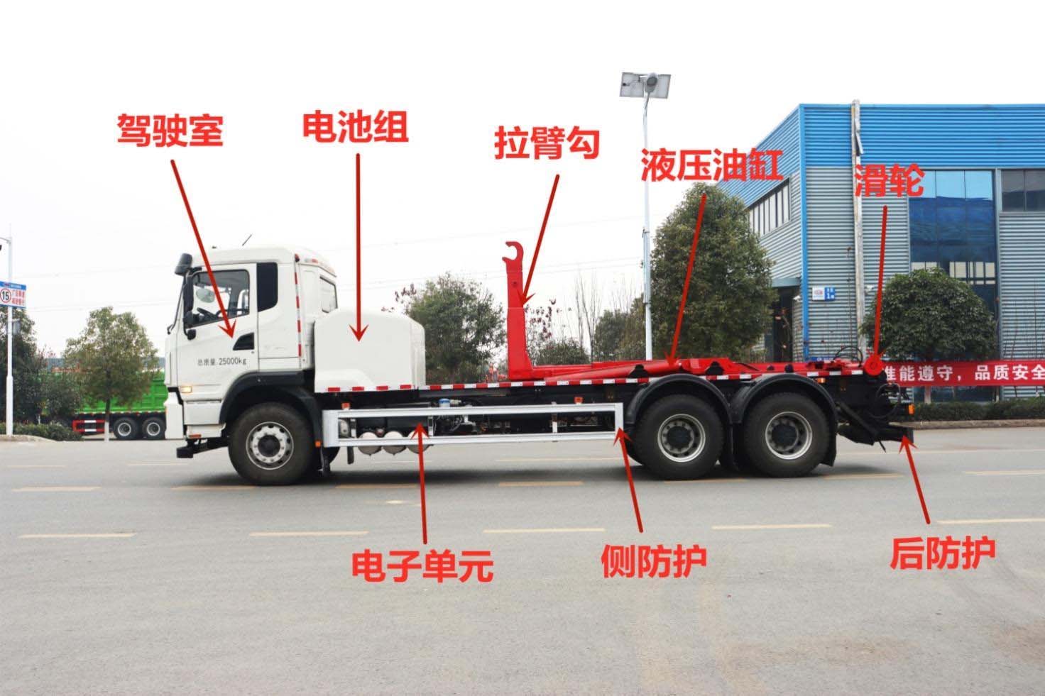 四、其他說明: 純電動車廂可卸式垃圾車是在純電動二類底盤的基礎(chǔ)上,加裝垃圾箱勾臂、液壓系統(tǒng),由機(jī)械、液壓 (氣路)、電器三部分合為一體的專用垃圾轉(zhuǎn)運(yùn)車。