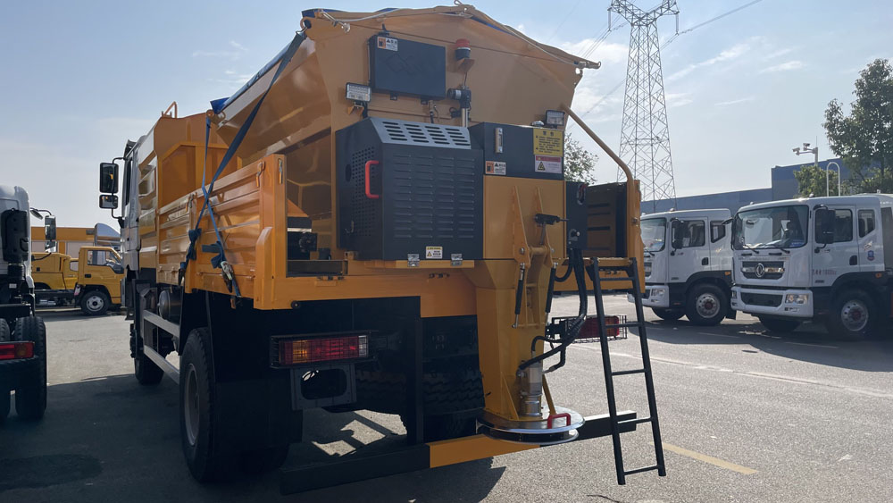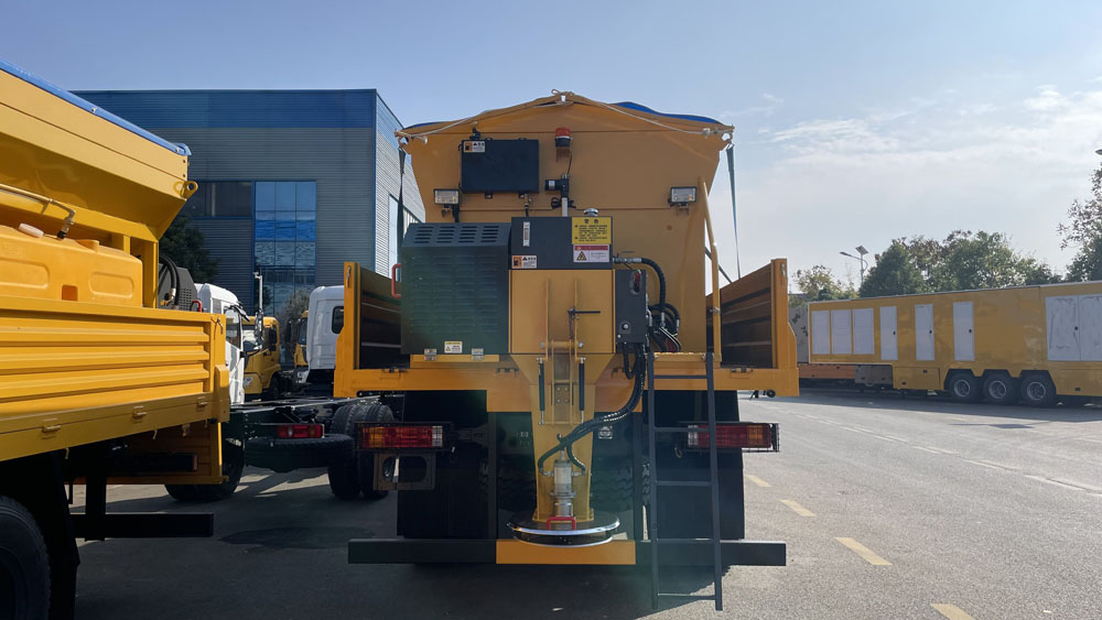 - 料箱設計合理:料箱容積較大,如有的型號可達 10m³,可減少加料次數,提高作業效率。整機及料斗內外采用碳鋼板結構,并進行防腐處理,撒布盤為不銹鋼材質,具有良好的耐腐蝕性,適應各種惡劣環境。料倉上蓋有網柵,可有效過濾大塊融雪劑,防止其堵塞輸送裝置;頂部還裝有遮蓋帆布,能防止雨、雪進入料倉,保證融雪劑的質量和撒布機的正常使用.