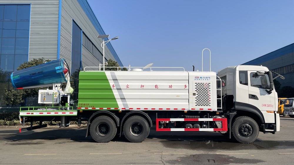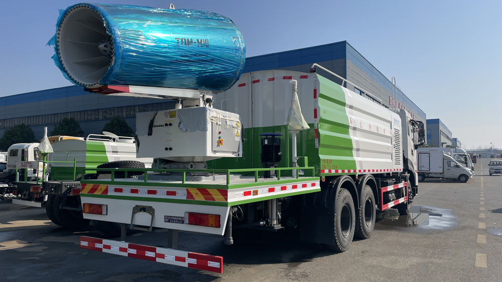 三、多功能抑塵車工作原理:霧炮機將水高壓霧化為50μm左右的細小顆粒,再通過遠程風炮將水霧送至100至120米半徑范圍內,作業5分鐘即可實現覆蓋區域面積4.5萬多平方米,是局部降低因PM2.5、PM10顆粒物超標而造成的霧霾污染的理想技術,是一種更先進、更科學、能耗更低、凈化效果顯著的新型空氣凈化技術。