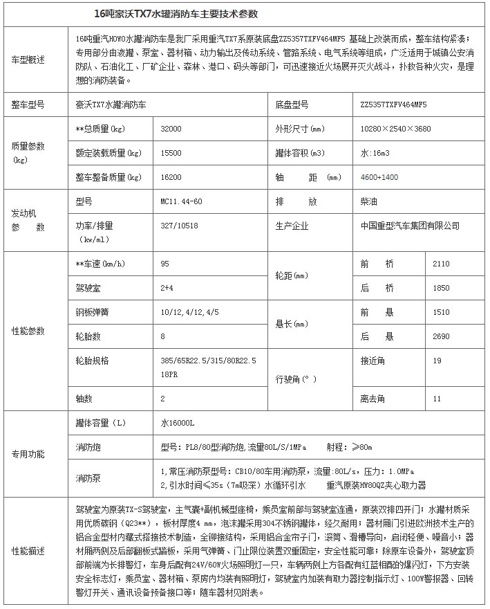| 備注 | 選裝后部帶拉梯架裝置及隨底盤部件布局選裝不同側面樣式。水罐容積為15.800立方米,水罐尺寸:4420×2450×1530mm。整體式側防護結構,后防護裝置材料:Q235A,截面尺寸:120×120mm,與車輛連接方式:螺栓連接,后防護離地高度:435mm,ABS生產企業為威伯科(上海)管理有限公司,型號為4460046300。主要專用裝置有消防泵、消防炮。 | ||